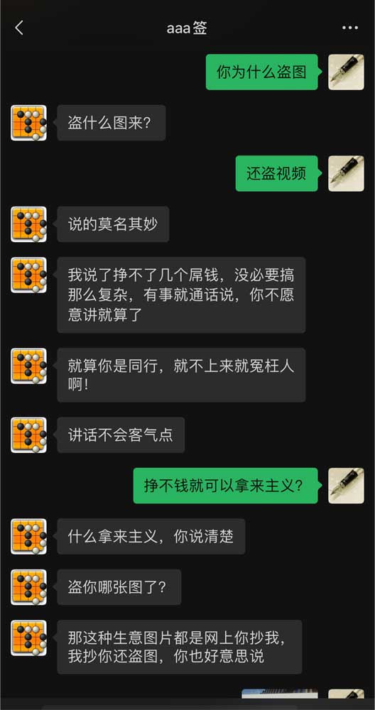 要说除了深圳的,其他地方的就一点水平没有了,一个他们做得晚,二是他们没经过手写的强化练习,(在深圳摆地摊一天签几百个名有了充分的磨练)你看有个南京的网站没有实际的东西,所有的图片,连视频都是盗用同行的,他还理直气壮(见图6聊天记录)你指望他怎么给你写?最重要的是会写字的人不一定会模仿,书法家他不会模仿签名,这是两个不同的职业,除非下功夫练习。